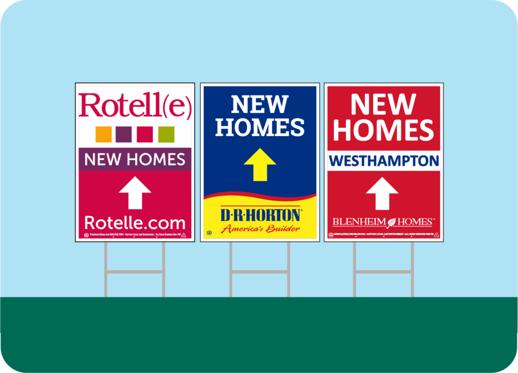 Keeping a design simple is the key to a successful sign. The most important text for a potential customer to contact a sales agent would be all the text recommended for a sign. This is typically under 6 words. A short message, such as “New Homes!” a logo and a phone number is all the information a person can read in just a few seconds while driving past a sign. A customer should never miss a turn because they were reading too many details about sales incentives on a sign. Always keep the goal of having potential customers reach your sales center in mind.